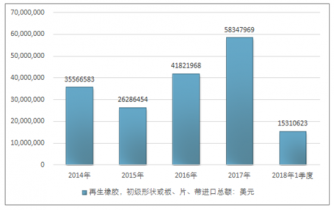 2016年我國再生橡膠,初級形狀或板、片、帶進(jìn)口總額41821968美元,2017年進(jìn)口總額58347969美元;2018年1季度進(jìn)口總額15310623美元。