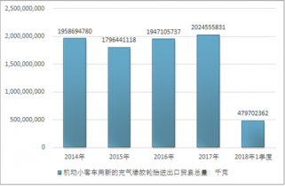 2016年我國(guó)機(jī)動(dòng)小客車用新的充氣橡膠輪胎進(jìn)出口貿(mào)易總量1947105737千克,2017年進(jìn)出口貿(mào)易總量2024555831千克;2018年1季度進(jìn)出口貿(mào)易總量479702362千克。