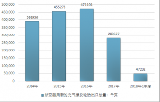 2016年我國(guó)航空器用新的充氣橡膠輪胎出口總量471101千克,2017年出口總量280627千克;2018年1季度出口總量47232千克。