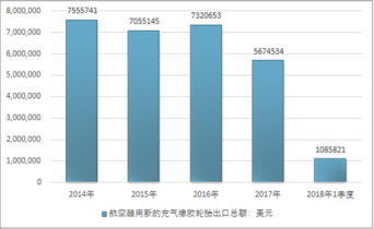2016年我國(guó)航空器用新的充氣橡膠輪胎出口總額7320653美元,2017年出口總額5674534美元;2018年1季度出口總額1085821美元。