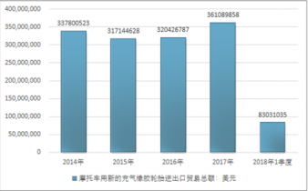 2016年我國(guó)摩托車用新的充氣橡膠輪胎進(jìn)出口貿(mào)易總額320426787美元,2017年進(jìn)出口貿(mào)易總額361089858美元;2018年1季度進(jìn)出口貿(mào)易總額83031035美元。