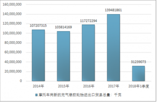 2016年我國(guó)摩托車用新的充氣橡膠輪胎進(jìn)出口貿(mào)易總量117272294千克,2017年進(jìn)出口貿(mào)易總量139481861千克;2018年1季度進(jìn)出口貿(mào)易總量31239073千克。