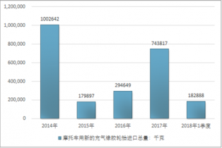 2016年我國(guó)摩托車用新的充氣橡膠輪胎進(jìn)口總量294649千克,2017年進(jìn)口總量743817千克;2018年1季度進(jìn)口總量182888千克。