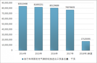 2016年我國自行車用新的充氣橡膠輪胎進出口貿易總量80129689千克,2017年進出口貿易總量76576635千克;2018年1季度進出口貿易總量17125355千克。