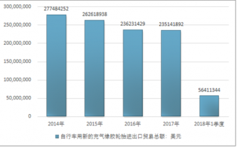 2016年我國自行車用新的充氣橡膠輪胎進出口貿易總額236231429美元,2017年進出口貿易總額235141892美元;2018年1季度進出口貿易總額56411344美元。