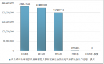 2016年我國農(nóng)業(yè)或林業(yè)車輛及機(jī)器用新的人字型或類似胎面的充氣橡膠輪胎出口總額197999715美元,2017年出口總額1005181美元;2018年1季度出口總額-美元。