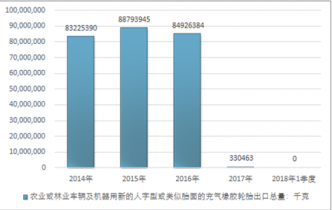 2016年我國農(nóng)業(yè)或林業(yè)車輛及機(jī)器用新的人字型或類似胎面的充氣橡膠輪胎出口總量84926384千克,2017年出口總量330463千克;2018年1季度出口總量-千克。