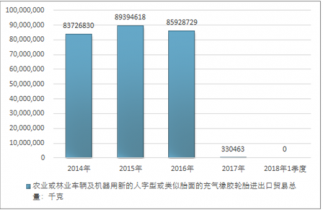 2016年我國農(nóng)業(yè)或林業(yè)車輛及機器用新的人字型或類似胎面的充氣橡膠輪胎進出口貿易總量85928729千克,2017年進出口貿易總量330463千克;2018年1季度進出口貿易總量-千克。