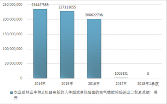 2016年我國農(nóng)業(yè)或林業(yè)車輛及機器用新的人字型或類似胎面的充氣橡膠輪胎進出口貿易總額200622798美元,2017年進出口貿易總額1005181美元;2018年1季度進出口貿易總額-美元。
