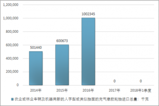 2016年我國農(nóng)業(yè)或林業(yè)車輛及機器用新的人字型或類似胎面的充氣橡膠輪胎進口總量1002345千克,2017年進口總量-千克;2018年1季度進口總量-千克。