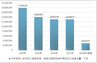 2016年我國汽車用實(shí)心或半實(shí)心橡膠輪胎、胎面及橡膠輪胎襯帶進(jìn)出口貿(mào)易總量12995239千克,2017年進(jìn)出口貿(mào)易總量12939672千克;2018年1季度進(jìn)出口貿(mào)易總量2822475千克。