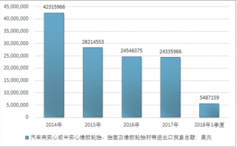 2016年我國汽車用實(shí)心或半實(shí)心橡膠輪胎、胎面及橡膠輪胎襯帶進(jìn)出口貿(mào)易總額24546375美元,2017年進(jìn)出口貿(mào)易總額24335966美元;2018年1季度進(jìn)出口貿(mào)易總額5487159美元。