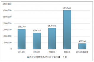 2016年我國未硫化橡膠制品進出口貿(mào)易總量1626035千克,2017年進出口貿(mào)易總量3012659千克;2018年1季度進出口貿(mào)易總量419594千克。