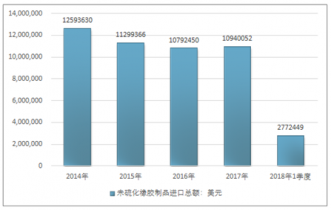 2016年我國未硫化橡膠制品進口總額10792450美元,2017年進口總額10940052美元;2018年1季度進口總額2772449美元。