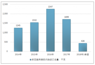 2016年我國航空器用橡膠內(nèi)胎進出口貿(mào)易總量5267千克,2017年進出口貿(mào)易總量5134千克;2018年1季度進出口貿(mào)易總量1580千克。