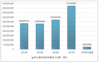 2016年我國硫化橡膠制避孕套進口總額323434793美元,2017年進口總額475196997美元;2018年1季度進口總額25847608美元。