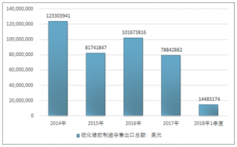 2016年我國硫化橡膠制避孕套出口總額101673816美元,2017年出口總額78842862美元;2018年1季度出口總額14483174美元。