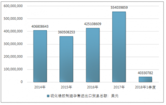 2016年我國硫化橡膠制避孕套進(jìn)出口貿(mào)易總額425108609美元,2017年進(jìn)出口貿(mào)易總額554039859美元;2018年1季度進(jìn)出口貿(mào)易總額40330782美元。