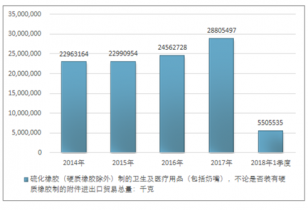 2016年我國硫化橡膠(硬質橡膠除外)制的衛生及醫療用品(包括奶嘴),不論是否裝有硬質橡膠制的附件進出口貿易總量24562728千克,2017年進出口貿易總量28805497千克;2018年1季度進出口貿易總量5505535千克。