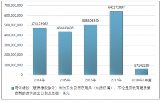 2016年我國硫化橡膠(硬質橡膠除外)制的衛生及醫療用品(包括奶嘴),不論是否裝有硬質橡膠制的附件進出口貿易總額505306340美元,2017年進出口貿易總額641271097美元;2018年1季度進出口貿易總額57142230美元。