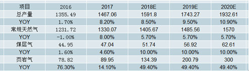 2018 年我國天然氣產(chǎn)量將達(dá) 1592 億立方米(常規(guī)天然氣 1406 億立方米,煤層氣 52 億立方米,頁巖氣 134 億立方米),同比增長仍將維持在 8.5%的高位