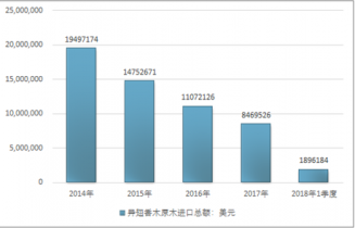 2016年我國(guó)異翅香木原木進(jìn)口總額11072126美元,2017年進(jìn)口總額8469526美元;2018年1季度進(jìn)口總額1896184美元。