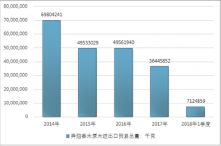 2016年我國(guó)異翅香木原木進(jìn)口總量49561940千克,2017年進(jìn)口總量36445852千克;2018年1季度進(jìn)口總量7124859千克。