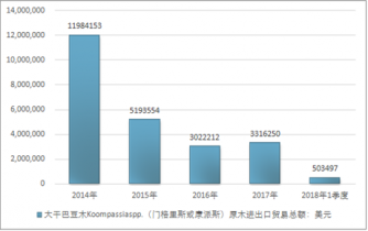 2016年我國大干巴豆木Koompassiaspp.(門格里斯或康派斯)原木進出口貿(mào)易總額3022212美元,2017年進出口貿(mào)易總額3316250美元;2018年1季度進出口貿(mào)易總額503497美元。