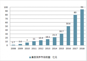 隨著經濟的不斷發展和測序市場規范化,中國測序市場增速明顯,以華大基因為龍頭的測序類公司均實現100%以上的復合增長;2007-2016年,我國基因測序的收入每年以62.2%的速度增長,2009年收入達到3.6億元,2010年突破7億元,2017年實現80億元,2018年約為94億元。