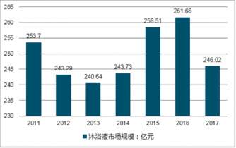 2016年我國沐浴類產品市場規模為261.66億元,2017年產業規模為246.02億元。