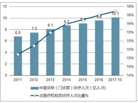 中醫(yī)類醫(yī)療機(jī)構(gòu)診療人次逐年增加,截止2017年10月,診療人次已經(jīng)突破10億人次。同時(shí),中醫(yī)類醫(yī)療機(jī)構(gòu)診療人次占醫(yī)療機(jī)構(gòu)總診療人次的比重也在持續(xù)增加,7年間增加了1個(gè)百分點(diǎn)。這表明,中醫(yī)類醫(yī)療機(jī)構(gòu)的服務(wù)能力提高,在整個(gè)醫(yī)療體系中所起的作用越來越大。