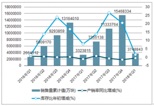 2018年Q1中國集成電路銷量累計(jì)達(dá)3748843萬塊,產(chǎn)銷率同比下降0.6%,庫存比年初增長1.6%;2017年中國集成電路銷量累計(jì)達(dá)15468334萬塊,產(chǎn)銷率同比下降1.4%,庫存比年初增長20.5%。