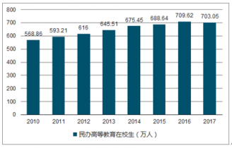 2016年我國民辦高等教育學(xué)校(機構(gòu))在校生總數(shù)為709.62萬人,2017年民辦高等教育學(xué)校(機構(gòu))在校生總數(shù)為703.05萬人,在校生總數(shù)同比減少6.57萬人。