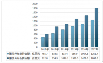 2012-2017年中國服務(wù)外包執(zhí)行金額及合同金額數(shù)量分析