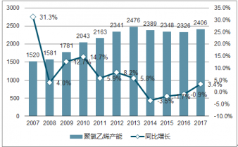 聚氯乙烯是氯乙烯單體在過氧化物、偶氮化合物等引發(fā)劑;或在光、熱作用下按自由基聚合反應(yīng)機(jī)理聚合而成的聚合物。2017年中國聚氯乙烯產(chǎn)能為2406萬噸,同比增長3.4%;2017年中國聚氯乙烯產(chǎn)量為1790萬噸,表觀消費(fèi)量為1771萬噸。