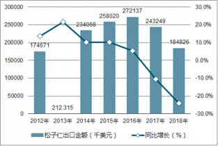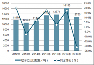 2018年1-12月中國松子仁出口數量為12750噸,同比下降21.1%;2018年1-12月中國松子仁出口金額為184826千美元,同比下降24%。