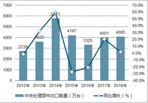2018年1-12月中國中央處理部件出口數量為4085萬臺,同比增長2.1%;2018年1-12月中國中央處理部件出口金額為20314674千美元,同比增長27%。