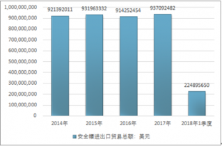 2016年我國(guó)安全帽進(jìn)出口貿(mào)易總額914252454美元,2017年進(jìn)出口貿(mào)易總額937092482美元;2018年1季度進(jìn)出口貿(mào)易總額224895650美元。