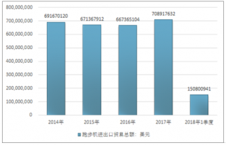 2016年我國(guó)跑步機(jī)出口總額606836521美元,2017年出口總額647870931美元;2018年1季度出口總額138346691美元。