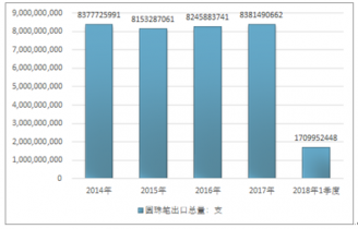2016年我國圓珠筆出口總量8245883741支 ,2017年出口總量8381490662支 ;2018年1季度出口總量1709952448支 。