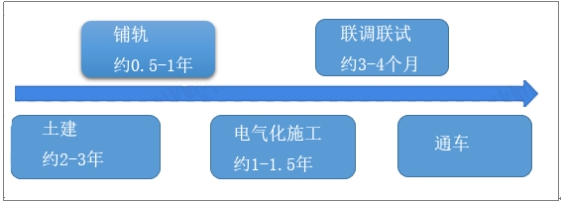 高鐵的建設(shè)包括土建、鋪軌、電氣化施工、調(diào)試、通車(chē)。其中土建工作約2-3年,鋪軌需要0.5-1年,電氣化施工約1-1.5年,聯(lián)調(diào)聯(lián)試3-4個(gè)月,最后通車(chē)。累計(jì)來(lái)看,從新開(kāi)工到鋪軌一般需要3-5年時(shí)間。