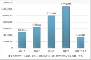 2016年我國櫻桃木木材,經(jīng)縱鋸、縱切、刨切或旋切,厚>6mm進出口貿(mào)易總量99733655千克,2017年進出口貿(mào)易總量127893501千克;2018年1季度進出口貿(mào)易總量32052829千克。