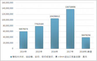 2016年我國櫻桃木木材,經(jīng)縱鋸、縱切、刨切或旋切,厚>6mm進出口貿(mào)易總額104296612美元,2017年進出口貿(mào)易總額136726906美元;2018年1季度進出口貿(mào)易總額38478256美元。