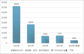 2016年我國櫻桃木木材,經(jīng)縱鋸、縱切、刨切或旋切,厚>6mm出口總量6753千克,2017年出口總量7137千克;2018年1季度出口總量2563千克。