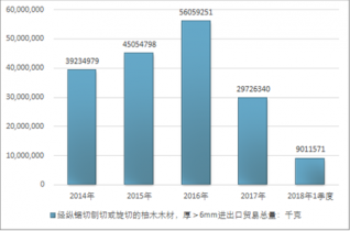 2016年我國經(jīng)縱鋸切刨切或旋切的柚木木材,厚>6mm進出口貿(mào)易總量56059251千克,2017年進出口貿(mào)易總量29726340千克;2018年1季度進出口貿(mào)易總量9011571千克。