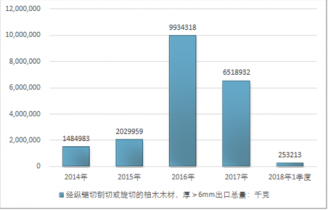 2016年我國經(jīng)縱鋸切刨切或旋切的柚木木材,厚>6mm進出口貿(mào)易總額53642104美元,2017年進出口貿(mào)易總額27455523美元;2018年1季度進出口貿(mào)易總額7058167美元。