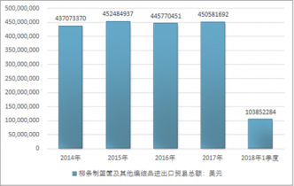 2016年我國(guó)柳條制籃筐及其他編結(jié)品進(jìn)出口貿(mào)易總額445770451美元,2017年進(jìn)出口貿(mào)易總額450581692美元;2018年1季度進(jìn)出口貿(mào)易總額103852284美元。