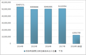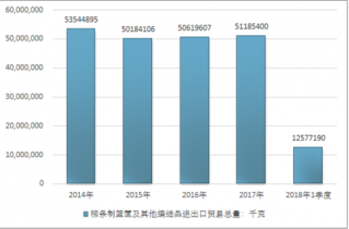 2016年我國(guó)柳條制籃筐及其他編結(jié)品進(jìn)出口貿(mào)易總量50619607千克,2017年進(jìn)出口貿(mào)易總量51185400千克;2018年1季度進(jìn)出口貿(mào)易總量12577190千克。