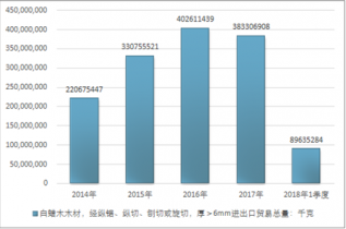 2016年我國(guó)白蠟?zāi)灸静,?jīng)縱鋸、縱切、刨切或旋切,厚>6mm進(jìn)出口貿(mào)易總額296580946美元,2017年進(jìn)出口貿(mào)易總額278003222美元;2018年1季度進(jìn)出口貿(mào)易總額67427989美元。