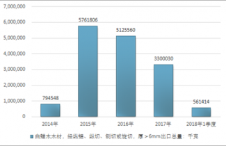 2016年我國(guó)白蠟?zāi)灸静模?jīng)縱鋸、縱切、刨切或旋切,厚>6mm出口總量5125560千克,2017年出口總量3300030千克;2018年1季度出口總量561414千克。